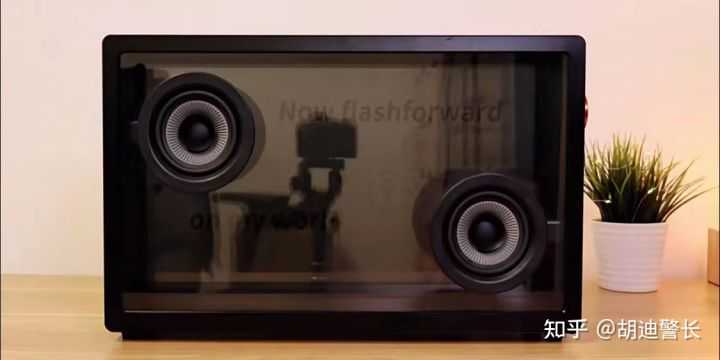 正反两面都是玻璃,左上角和右下角各有一个扬声器,很像家庭版文艺风格的卡拉OK!