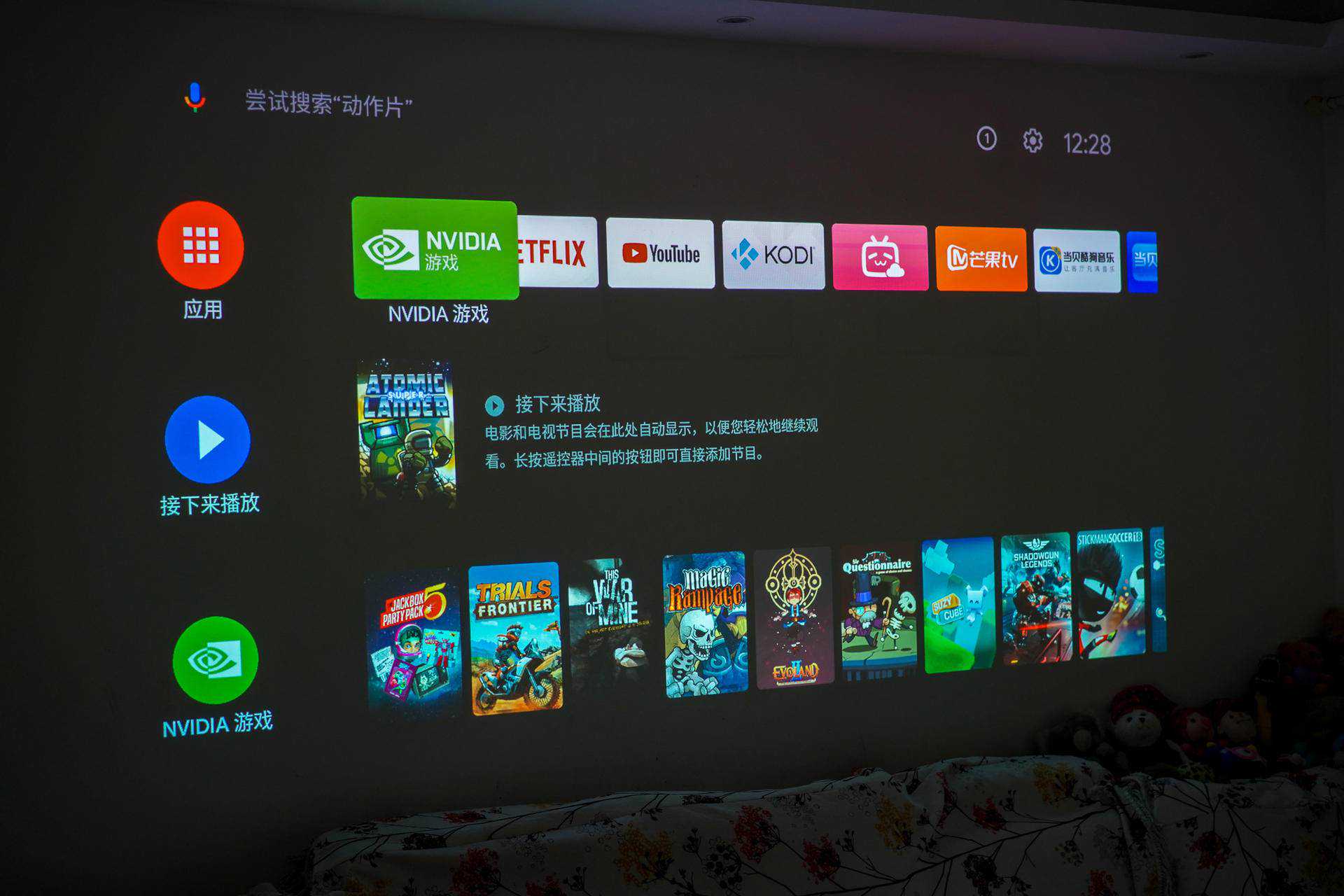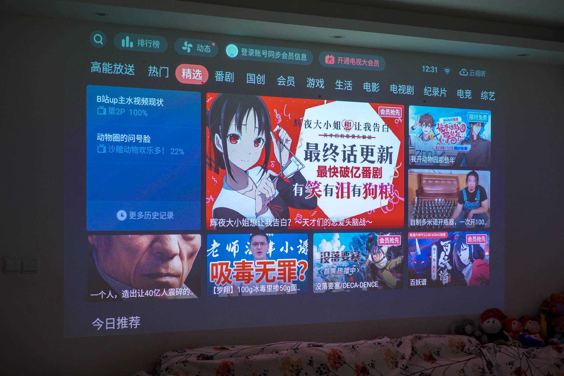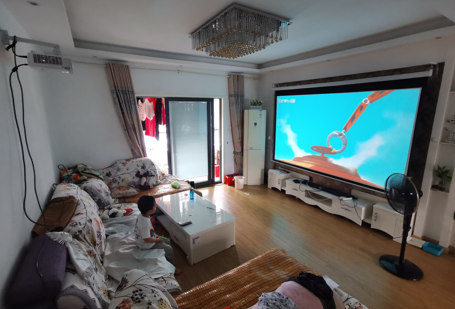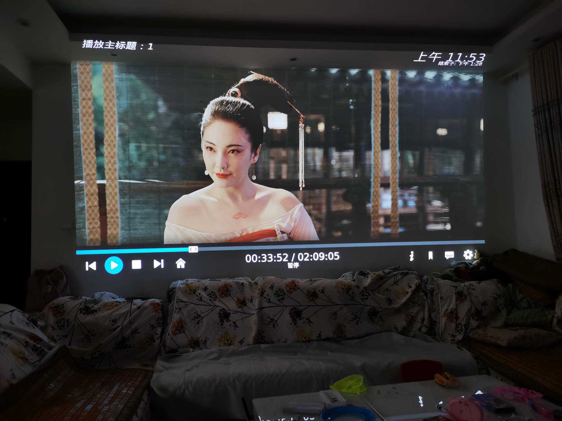 1、虽然是白墙,投射的投影画面,真的很清晰,但是每次看电视都需要坐在地上看,难免有点奇怪,电动幕布肯定是要买了: