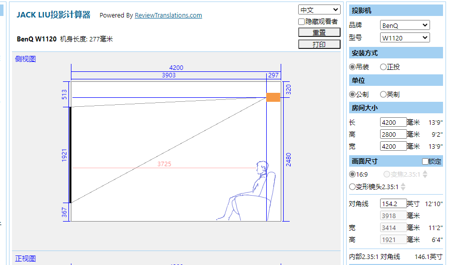这个工具可以很好的计算出家里投影仪的位置摆放,以及幕布合适的尺寸: