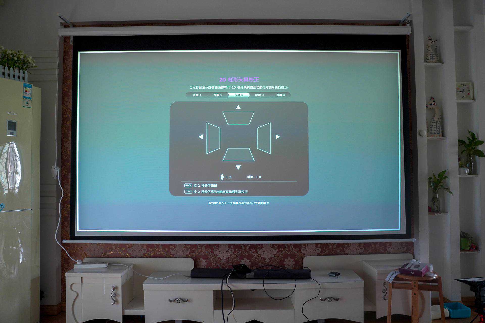 6、首先进行梯形校正,如果是购买二手投影仪,找不到校准的地方,可以选择重置一下投影仪,就可以找到梯形校正的地方了,目前这个投影的面积,至少在120寸以上: