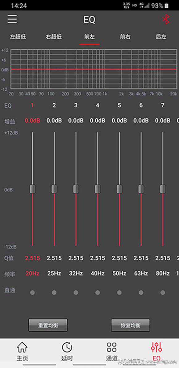 P4支持蓝牙连接用手机小程序调音,也可以用USB线连接PC软件调校。从软件调试可以看到,6路DSP中,1-4声道10段EQ均衡,5-6声道6段EQ,增益精度0.1dB,延时校准最大可到1.87米。主动分频频率精度1Hz,斜率6-36dB/Oct.可调。从DSP的三大功能来看,除了EQ段数,其它精度和可调范围基本差别不大。