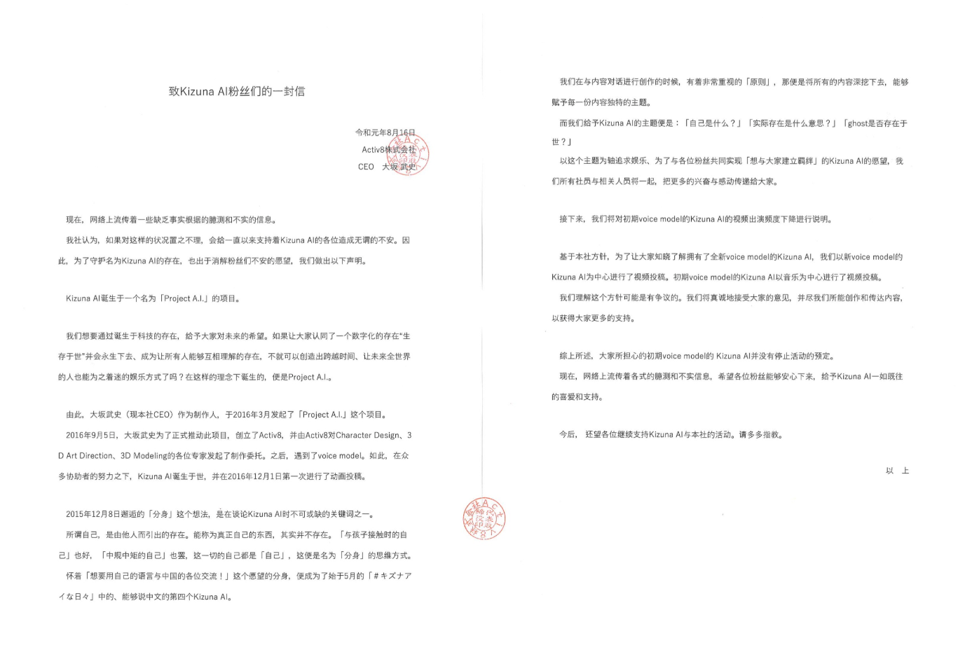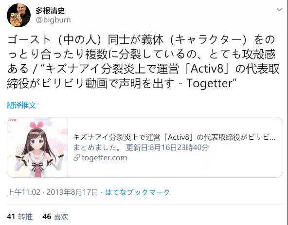 从官方公告浅谈虚拟主播背后的人格——中之人8月16日,大坂武史以Acitv8CEO的身份通过B站绊爱官方账号发表了声明。