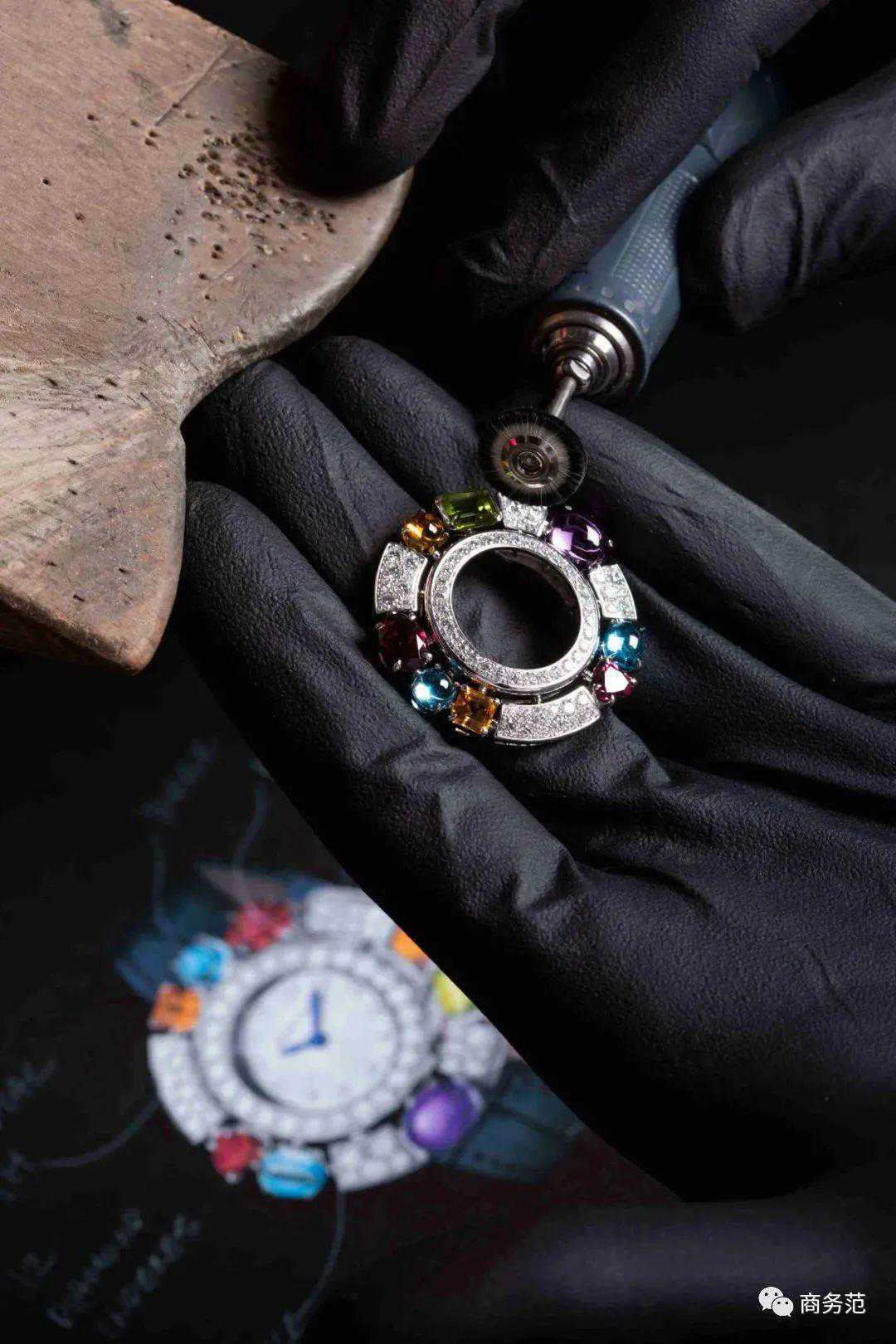 这款腕表采用了“雪花镶嵌”工艺,将不同尺寸的宝石紧密排列在腕表上。只有让宝石之间的贴合精确到微米,才能呈现出这样不拘一格的华美。