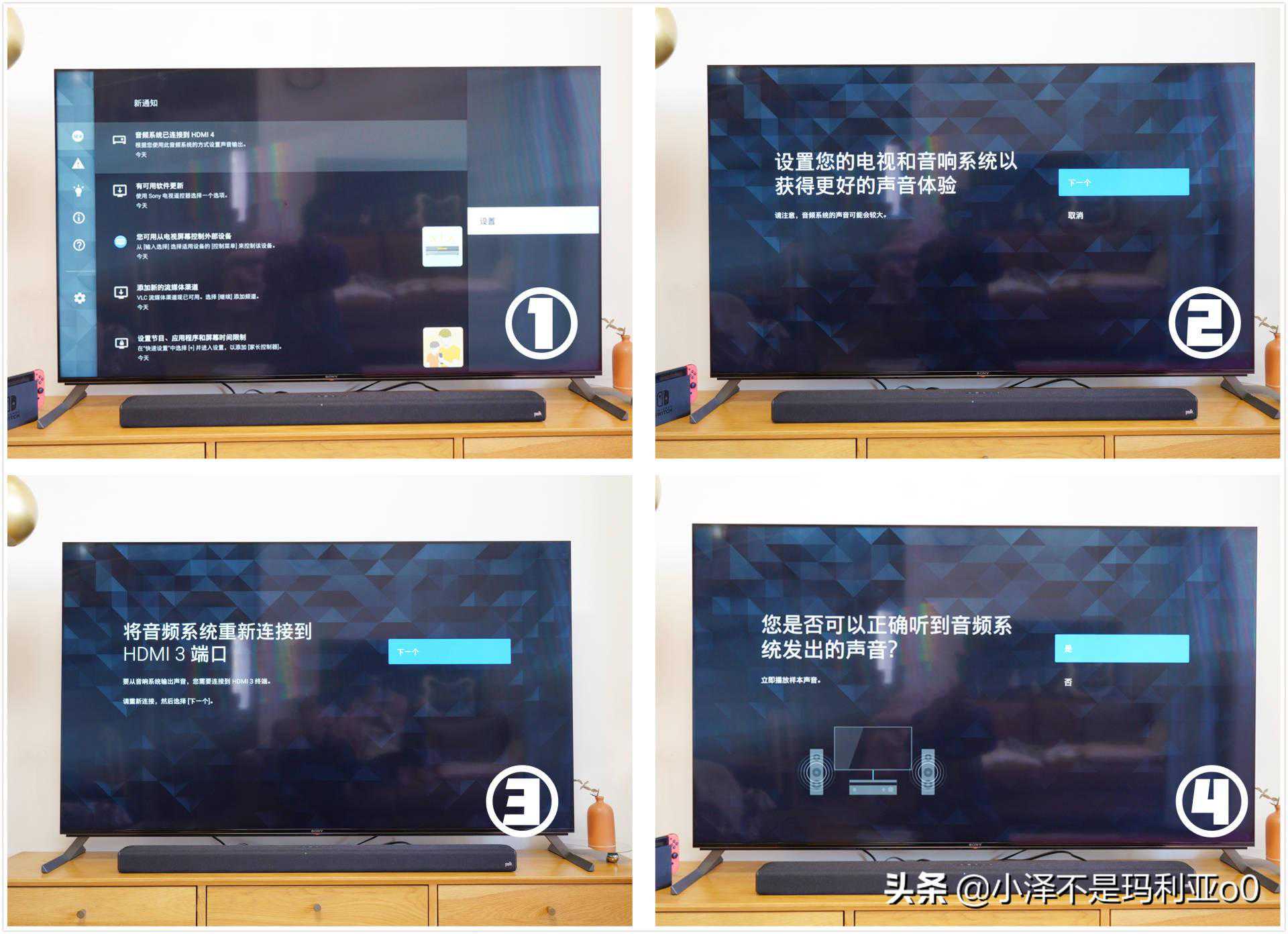 ▼连接电视之后,电视会自动识别已经接入的外接音响系统,这里需要注意的是使用HDMI线连接时,一定要将线接到电视的HDMI(ARC)接口,像我之前就是随便找了一个HDMI接口连接,后来怎么都不出声音,仔细检查之后才发现是接口接的不对,接好连接线,经过简单的设置之后,今后再开机,电视就会默认用外接音响播放声音了。