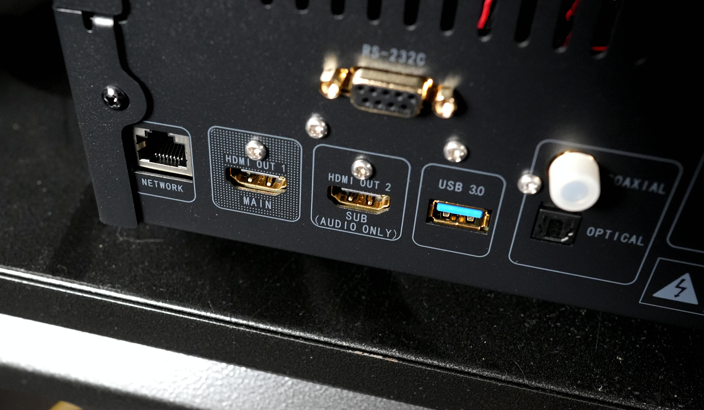 两个HDMI和USB接口,也是金光灿灿的。
