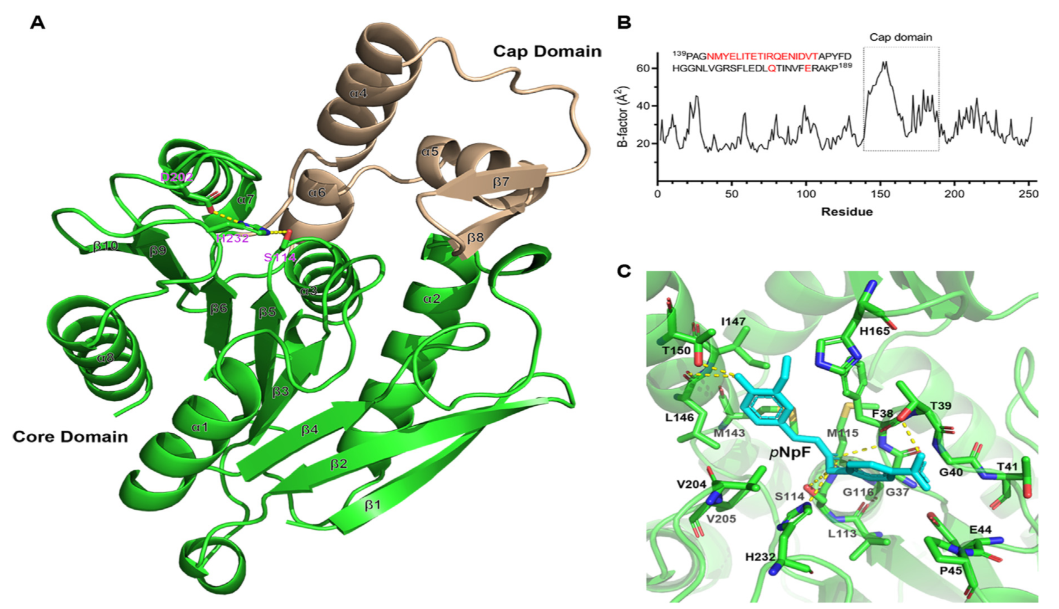 为了找到GthFAE的催化口袋,进行了分子对接研究,将底物pNPF对接到GthFAE的疏水空腔中,从300次运行中得到了12个不同的构象簇。Rank1簇包含的构象比其他簇多得多,更重要的是,它包含了结合能最低的簇,其结合能为-8.18kcal/mol。在构象中,组成催化口袋的pNPF5Å内有19个残基,但消除了高度保守的残基,其中只有11个被认为是诱变的候选者(图1C)。根据保守性分析的多序列比对,天冬酰胺在与GthFAE中的Thr41序列同源物的第41位残基对应的位点出现的频率要高得多。丙氨酸的情况与Ile147相似。此外,Met143、Leu146、Ile147和Thr150被用FoldX通过PositionScan选择用于计算机突变,因为它们的B因子排名最高。除Met143外,有3个突变体ΔΔG0,应为有益突变体。值得注意的是,Thr150是一个“热点”,因为其19个突变体中有14个的ΔΔG值为负值。Thr41位于核心区β3和α1之间的环上,Leu146、Ile147和Thr150均位于帽状区面向催化口袋的α4上。残留物均暴露在表面。因此,作者对Thr41、Leu146、Ile147和Thr150进行了诱变,重点研究了Thr150,构建了6个突变体:T41N、L146A、I147A、T150Y、T150R和T150I。