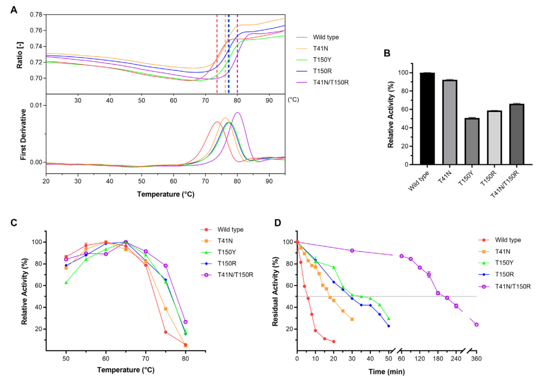 如图2所示,T41N、T150Y和T150R突变体的Tm值分别比野生型(73.6℃)高2.6℃、3.9℃和3.6℃,其中T150Y最高77.5℃。由于T150Y和T150R的Tm值相似,相差0.3℃的微小差距,考虑到T150R的更高活性,作者仅将T150R与T41N组合形成突变体T41N/T150R,Tm达到80℃,增加了6.4℃。不幸的是,与Tm上升相反,所有突变体的酶活性都降低了,与60℃的相对活性相比,T41N最接近野生型,其次是T41N/T150R。
