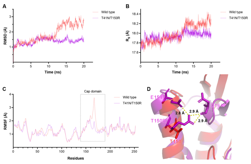 作者认为本研究中组合突变体的热稳定性提高与T150和周围天冬氨酸或谷氨酸之间引入盐桥,以及T41N提高蛋白质表面亲水活性的综合结果。为了研究热稳定性性能的分子基础,进行分子动力学模拟以检查GthFAE在突变前后的结构变化。RMSD和回转半径(Rg)的分析均表明T41N/T150R的结构比野生型更稳定,骨架Cα原子的RMSD值表征系统的稳定性,Rg代表蛋白质的紧密度(图3A和B)。RMSD图显示T41N/T150R系统在模拟开始后很快达到平衡,而系统在野生型达到平衡之前波动了15ns。当系统处于平衡状态时,突变体的Rg值略低可以证明它与野生型相比具有更接近的构象,这可能是由于T41N亲水作用所致。在最后2ns期间,两个系统处于平衡状态,残基的平均RMSF值表明突变体的稳定性可能是由于帽域的灵活性降低(图3C)。然而,残基41周围没有显著变化,如图3D所示,T150R通过将盐桥引入E154和D164的区域来稳定帽域,这与作者的推测一致。因此,MD模拟的结果可以解释为什么突变对热稳定性起作用。