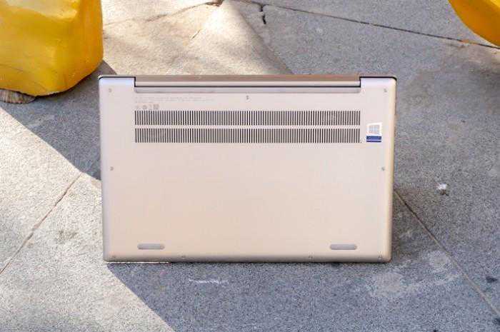 D面主要是散热孔,联想YOGAS740-14在D面的上部和左下角以及右下角均设置了较高的脚垫,一是适当的增加了机身倾斜度在敲击键盘的时候可带来更好的使用感受,二是为了抬高机身底部以更好的空气流通进行散热,三是起到增加摩擦力防滑的作用。