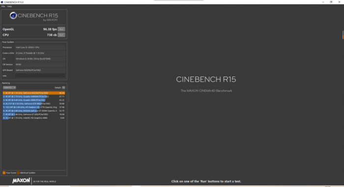 接着我们使用CINEBENCHR15对YOGAS740-14的单核和多核性能进行测试。小编使用Fn+Q快捷键将YOGAS740-14的性能模式调整为“野兽模式”,充分发挥处理器的潜力。通过CINEBENCHR15测试看到,十代酷睿i5-1035G1得分738cb。