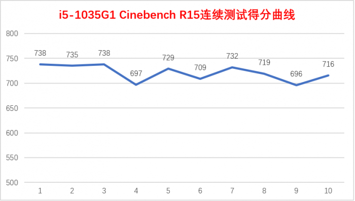 为了进一步测试这款处理器的定性,我们在同样的使用环境下,用CinebenchR15又连续测试9次,从得分曲线来看,十代酷睿i5-1035G1得分基本稳定在700-750之间,性能释放还是较为稳定的。