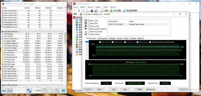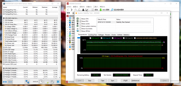 我们分别使用AIDA64CPU和AIDA64FPU进行测试,各进行30分钟,我们通过上面的截图可以看到,在AIDA64CPU测试中处理器温度为86℃,功耗为27.3W,C面键盘和触控板区域的温度在舒适范围内;而在AIDA64FPU测试中温度为88℃,功耗为29.4W,C面键盘和触控板区域的温度虽然比刚才上升但是仍在可接受范围内。