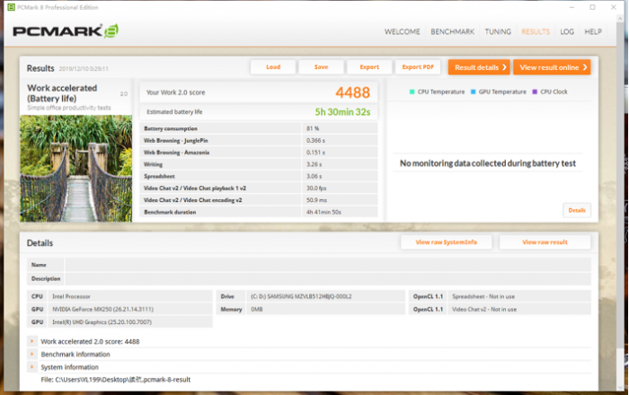 最后不能忽略的就是续航的测试了,毕竟YOGAS740-14是一款轻薄笔记本电脑,续航这一项还是非常考验其实力的。这款笔记本电脑内置了62Wh大容量电池,并且支持充电1刻钟使用2小时的快充功能,根据官方数据可满足10小时长续航。我们通过PCMARK8Work模式下测试得到的续航时间为5小时30分32秒。