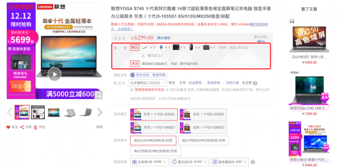目前联想YOGAS740-14这款笔记本在京东售价6299元,还可领取“满5000减600”的优惠券,可以说优惠力度很大,相当于到手价5699,结合这款轻薄本的整体性能来看并不贵,轻奢的年轻商务白领亦或是学生很适合入手,尤其适合大多数的女生朋友,大家不要错过。