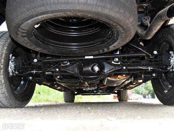 后桥采用钢板弹簧悬架,比较有特点的是后桥减震器在安装上并不是左右侧同方向,而是采用一前一后,这样减震器能够吸收更多来自不同方向的震动,提高一点行驶舒适性。