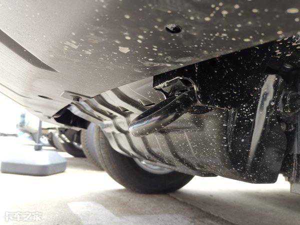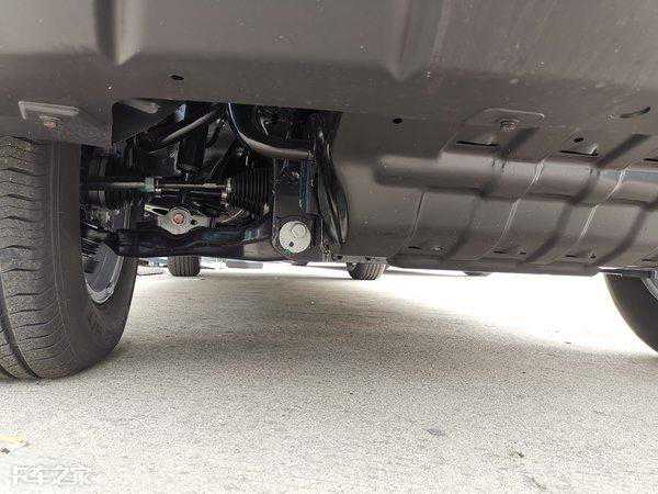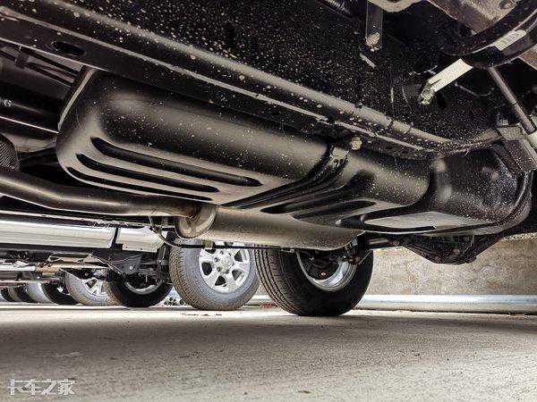 车架与前悬之间设计有支座,支座上安装有橡胶,毕竟车辆自重达到两吨,激烈操控时,悬架过度压缩必定会与车架发生硬性接触,损坏车架及悬架。尾气后处理系统也高于元宝梁,降低了磕碰几率。
