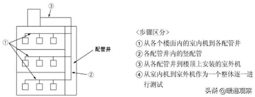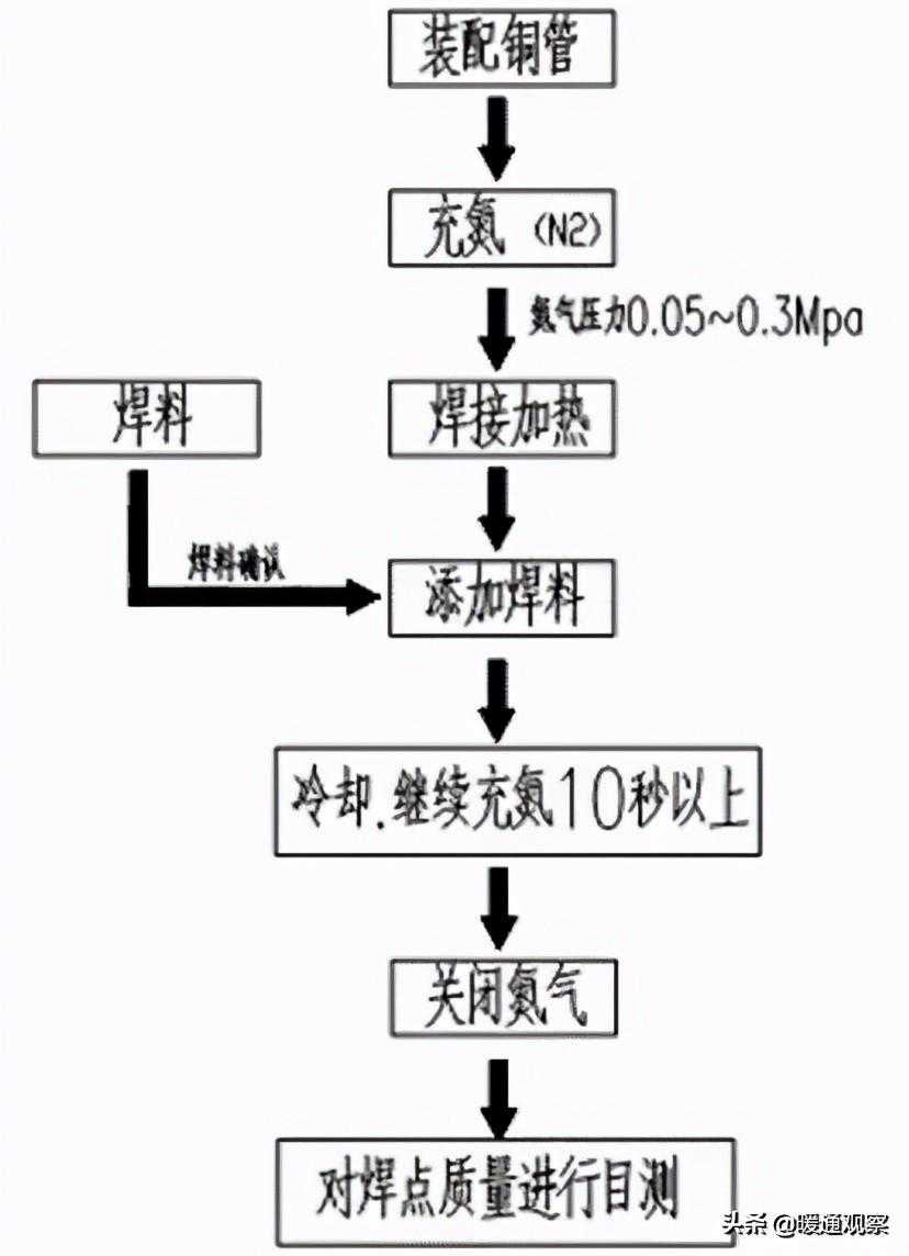 施工准备→材料选择→复核配管尺寸→→铜管敷设→钎焊连接→管道冲洗→气密试验→管道保温→真空干燥→冷媒追加→调试运行