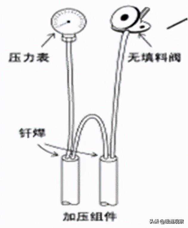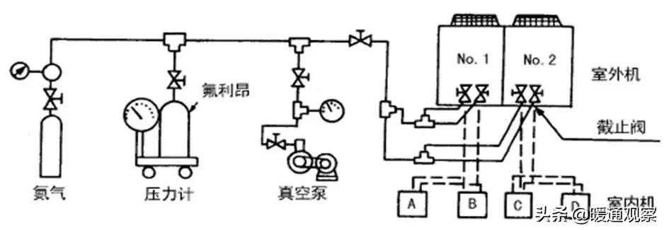3、冷媒管焊接过程中必须充氮气保护,并根据实际施工经验总结出了合理的压力值,避免了氮气流量过大,焊接处容易产生砂眼,流量过少,则会产生氧化膜过多氮气必须从焊接处流过的弊端。并提出切实可行的充氮气方法。