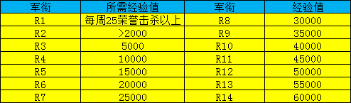 举个栗子:假设某玩家每周获得6300的PVP经验,那么最大军衔经验=5*6300=31500。参照前表,也就是R8。