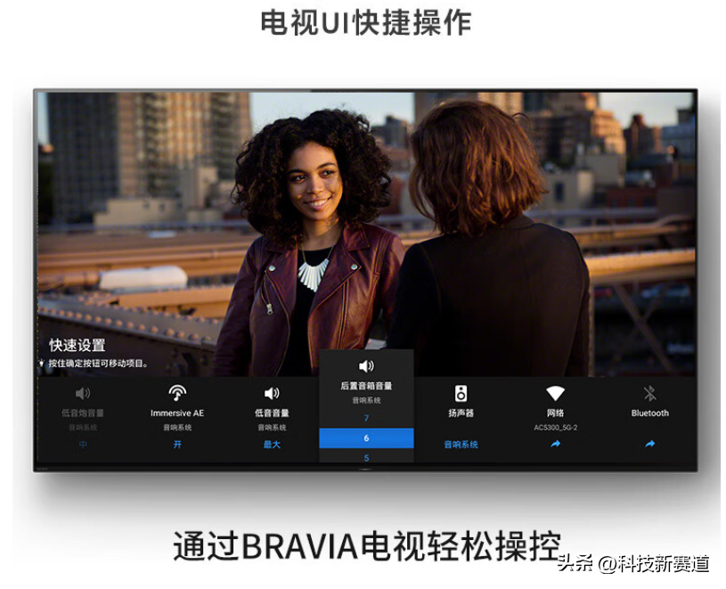 这套家庭影音设备和索尼电视搭配使用,可以开启中置声场同步模式,这样电视就变成了另一个中置音箱,两者相加,有一种音画合一、浑然天成的感觉。因为同一个生态系统,索尼电视能快速识别HT-A7000,不仅能通过电视遥控器控制回音壁,同时可以在电视界面的快捷菜单中建立常用的回音壁设置,操控便捷性大大提高。
