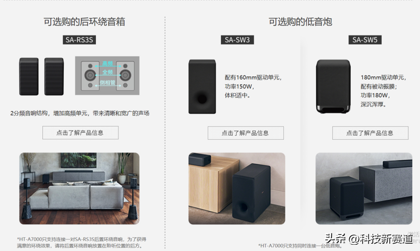 此外,索尼提供了各两款后置环绕音箱SA-RS3S和SA-RS5、和低音炮SA-SW5和SA-SW3,大家可以依据自己对环绕和低音的不同偏好进行自由搭配。