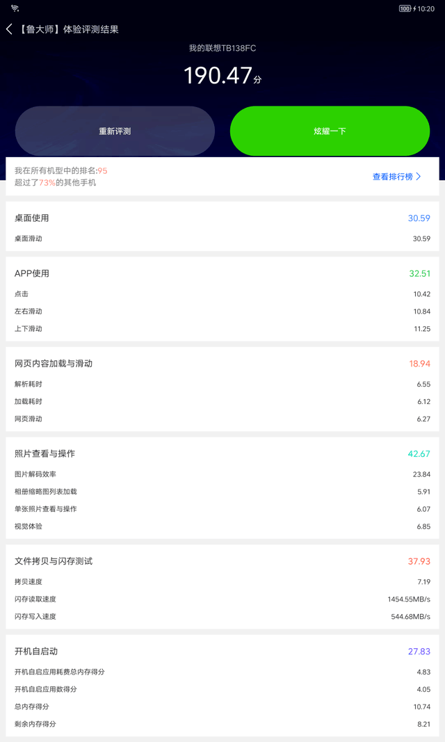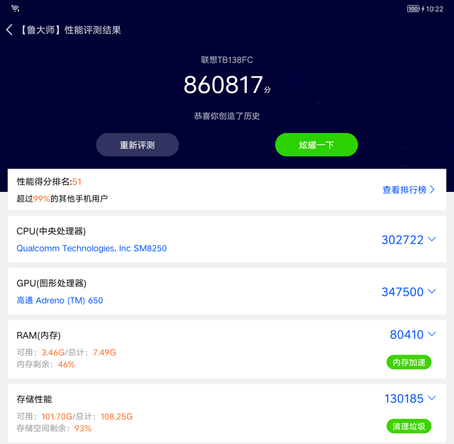 在鲁大师的测试中,综合性能得分882405分,而体验得分也达到了190.47分,此分数均排在业界最高的水平,足以证明联想小新PadPro2022的运算速率相对不错。