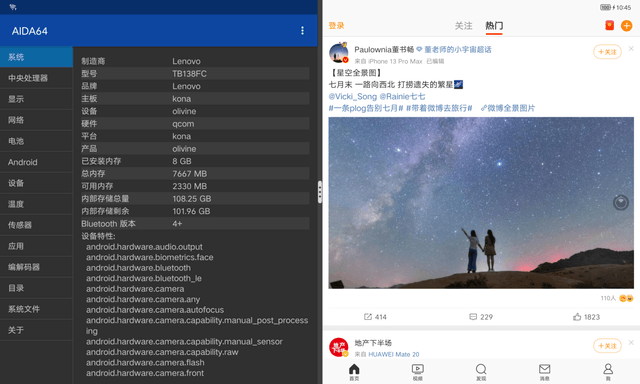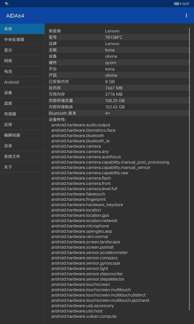 通过AIDA64检测硬件信息,我们可看到,这款平板除具备高通骁龙870处理器外,还拥有8GB内存和128GB的硬盘存储容量。因此,再来测试下硬盘读写的能力是否出色。