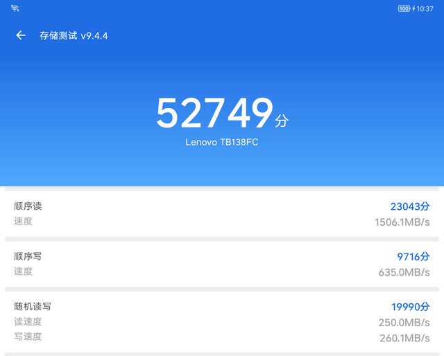 从综合得分52749分来看,联想小新PadPro2022的硬盘性能的确出色。而且顺序读取速度1506.1MB/s,顺序写入速度635MB/s,相当之快,表现出应有的实力。