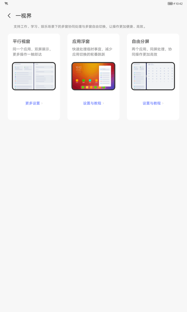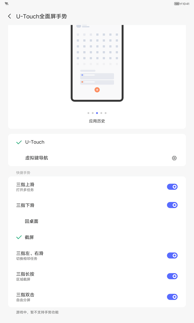 U-Touch手势操控功能可以设置三指上滑打开多任务模式、三指下滑截屏or回到桌面、左右滑动切换相邻任务、长按区域截屏以及双击自由分屏等功能,让操控变得更加简单,全面提高效率。