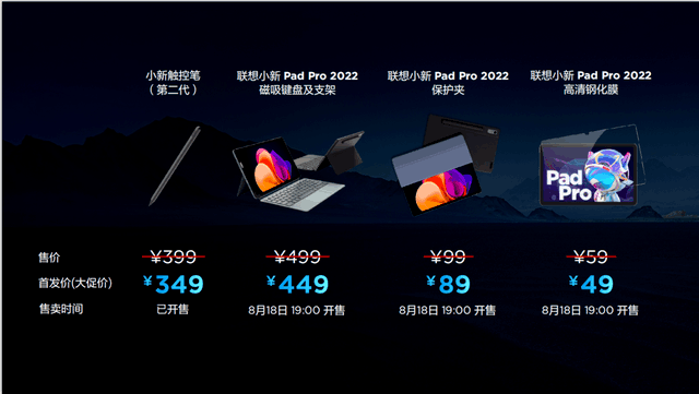 与联想小新PadPro2022搭配使用的联想小新PadPro2022磁吸键盘及支架首发价449元;联想小新PadPro2022保护夹首发价89元;联想小新PadPro2022高清钢化膜首发价49元。小新触控笔(第二代)大促价349元,目前已经在火热售卖中。