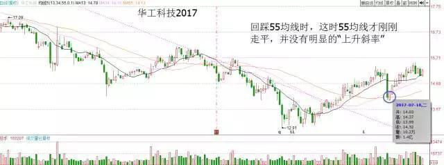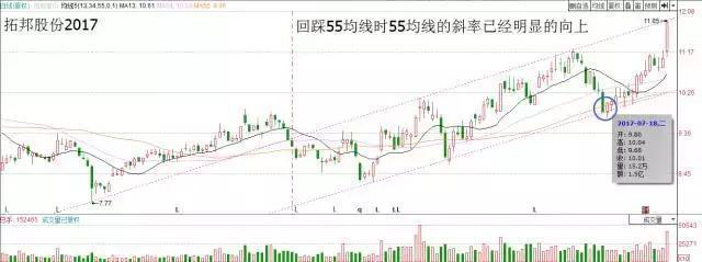 如图:两个例子都是2017.7.18回踩55均线,为什么后期的涨幅不一样呢?主要是55均线的“斜率”。