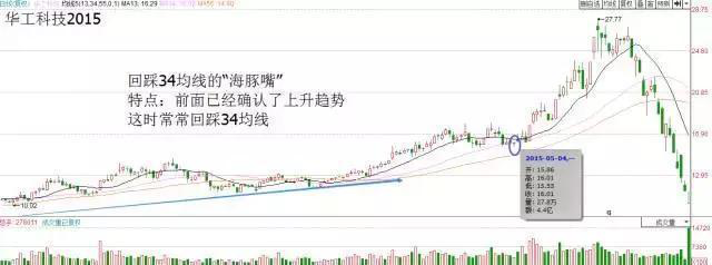 具体到34均线出现海豚嘴还是到55均线出现海豚嘴,这是有前期的趋势决定的,如果前期是一波下跌趋势,则可能回调55均线左右,因为回调55均线是二浪的回调。