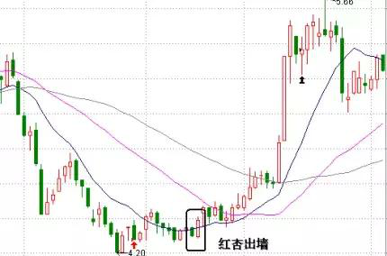 均线系统呈典型的空头排列,股价长期下跌并远离长期均线,当13日均线由下降逐步转向走平,股价k线从下向上突破了13日EMA均线,并且在13日EMA均线上当日收阳站稳,这个时候,我们可以将这根突破站在13日均线上方的阳线称为“红杏出墙”。
