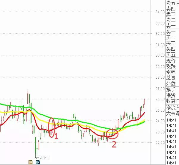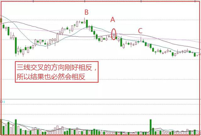 1、三线交集,必须是13日均线从下往上穿过55日均线,34日均线从上方往下方穿过55日均线。