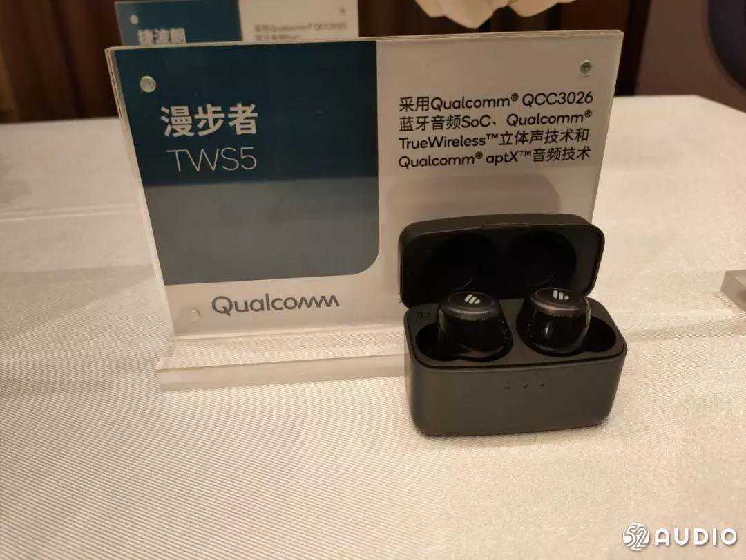 漫步者TWS5真无线立体声耳机采用高通QCC3026蓝牙音频SoC、高通蓝牙立体声技术和高通aptX音频技术。