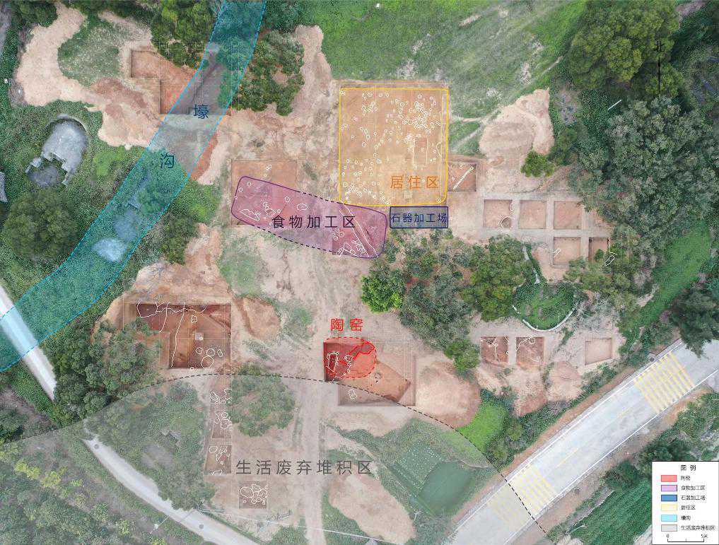 考古发现,随着时间由远及近推移,遗址中的遗迹也相应发生变化。从最久远的西营、祠堂后山遗址到壳丘头遗址,遗迹由以生活痕迹为主的小型聚落形态,向具备居住区、手工业区、餐食加工区等清晰功能区分的中型聚落转变。