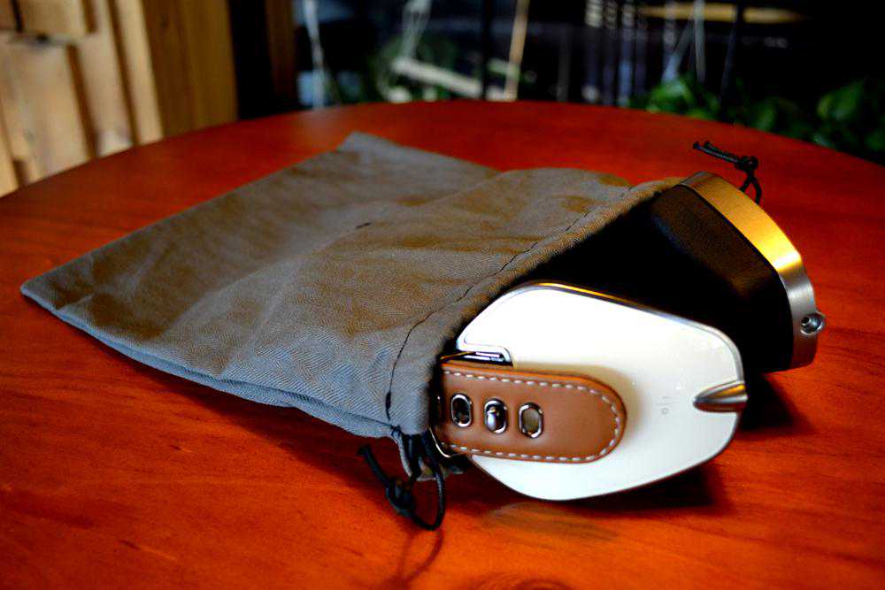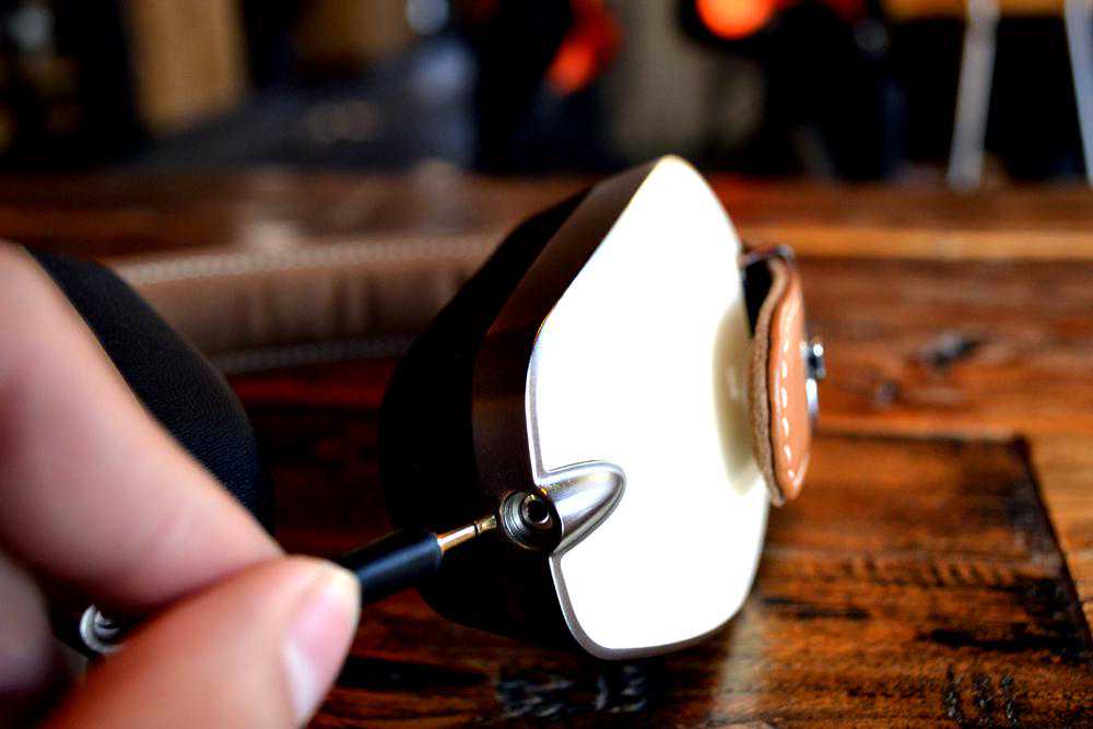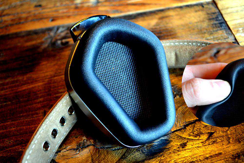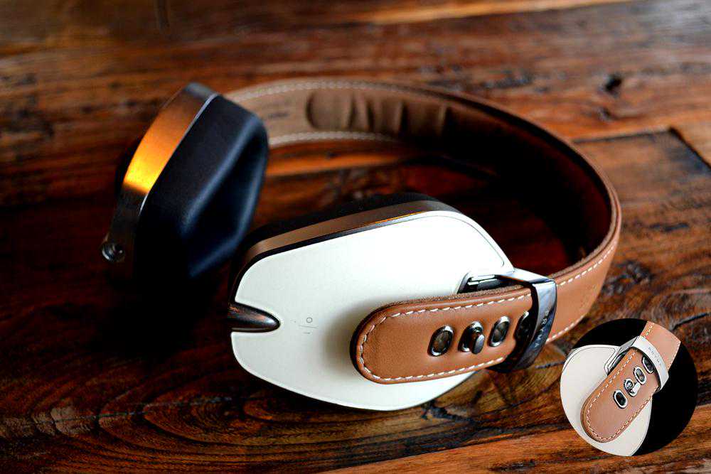 头带部分类似于妹子用的发卡,外部由牛皮材料进行包裹。内侧头梁部分则用了柔软的翻毛皮增加佩戴舒适度,所采用的皮料都是遵循着意大利皮革工艺制作而成。在头带的末端位置各有四个固定卡孔,这便是固定耳罩单元用的。将头带伸进耳机单元的卡槽内,选择好适合的长度,然后拧动锁紧旋钮即可完成组装。