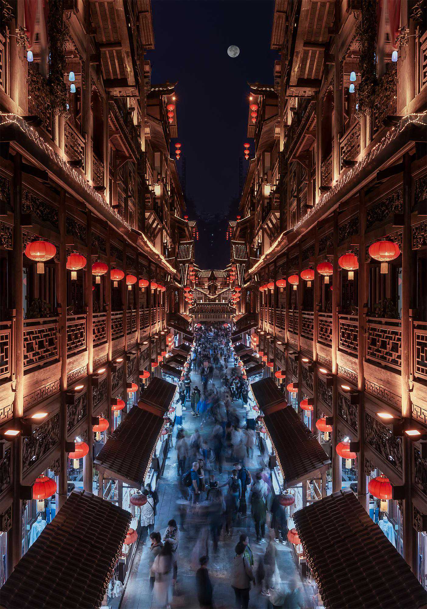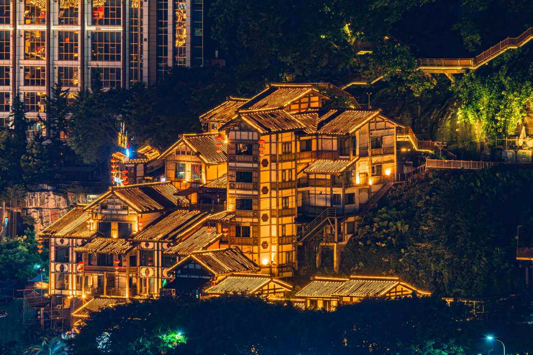 洪崖洞是悬崖上的吊脚楼,夜晚降临,星光初现,由无数灯光织成的霓裳,让洪崖洞瞬间化身为《千与千寻》中不可思议之的场景。