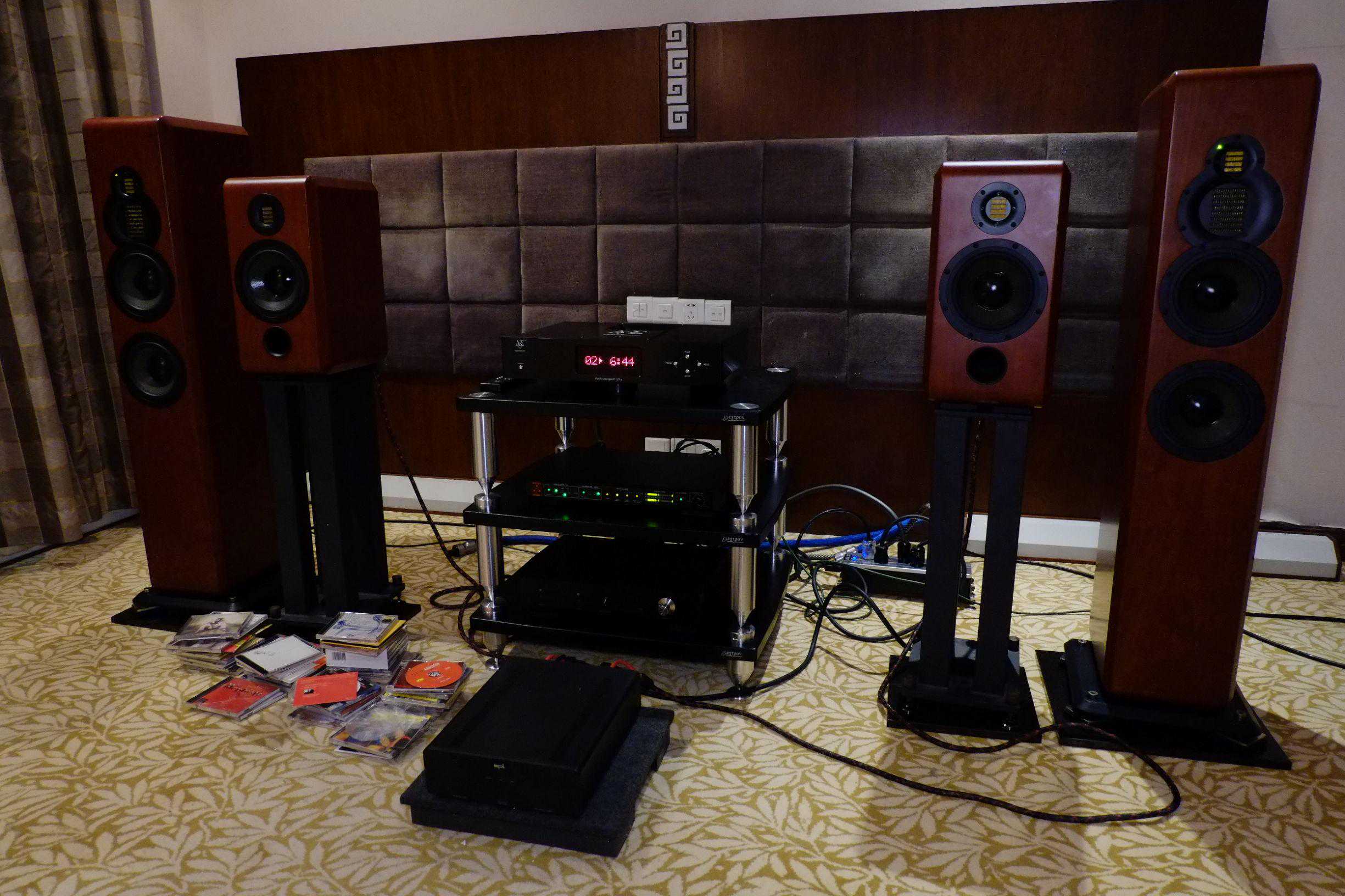 唯一让三耳君两顾展房等候皇帝位试听的组合。美国BricastiM1解码前级一体机搭配M28单声道后级,驱动ATCSCM50ASLT喇叭在整个展会中声音独树一帜,精准的声音还原和凌厉的动态非常突出。坦然,这套系统当然未算展会中素质最强大的,但确实被向来Hi-Fi和专业类音频器材同好的三耳君所喜欢,在展会中游走多时再听这种声音会感觉冲击力更强。