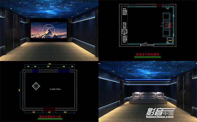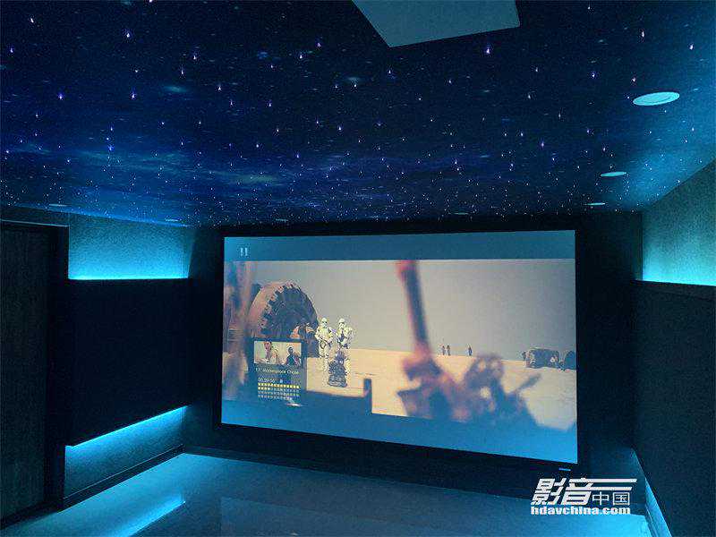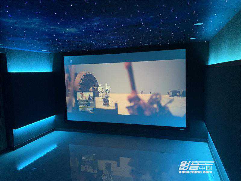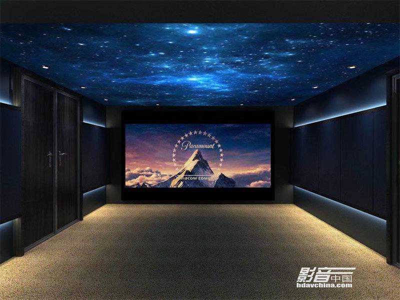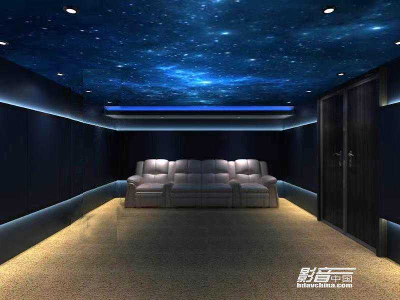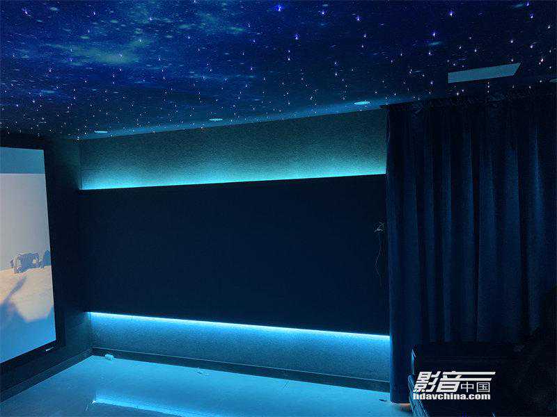 颜色搭配方面,灰色系墙面与冰蓝光灯饰冷色系的碰撞,融合一体。前墙的黑色饰面与画框幕布边框颜色相同,将白色幕布反衬出来,在观影时可有效避免对视觉效果的影响。顶面在星空顶基础上升级喷绘图案,在平时也可欣赏炫彩星空。
