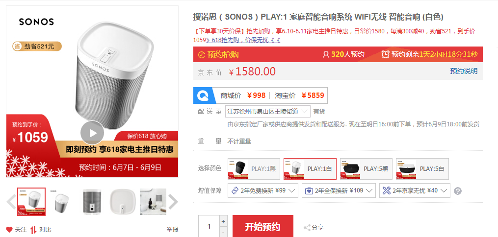 SONOSPLAY:1平时价格为1580元,618期间价格为1059元。只可惜这个价格与这款产品的历史最低价出入还是比较大的,去年SONOSPLAY:1曾降到过899元。