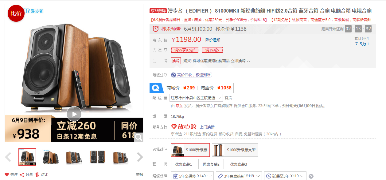 漫步者S1000MKII平时价格为1198元,618期间价格为938元;