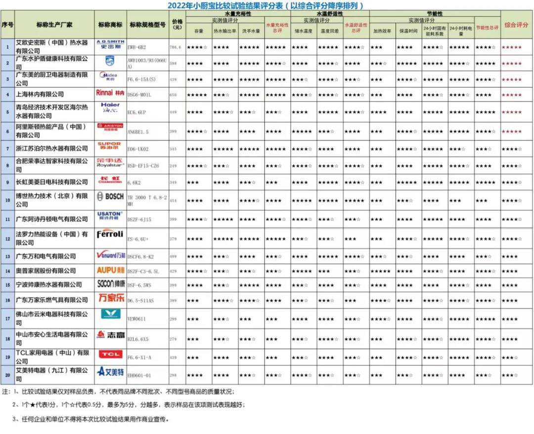 20款小厨宝评分总表: