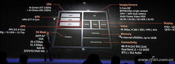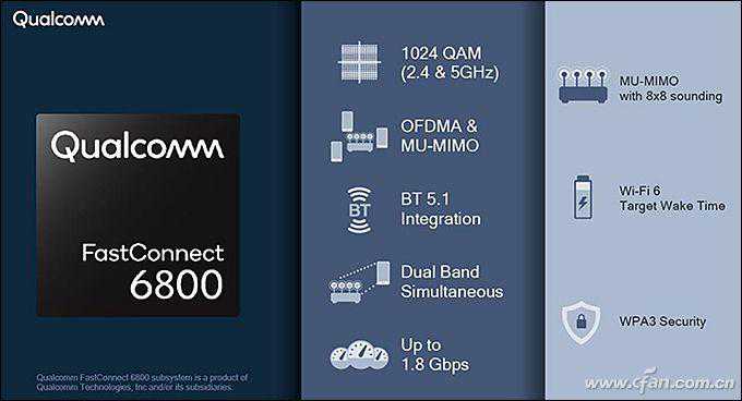 比如,骁龙855就直接集成了Wi-Fi和蓝牙单元,而骁龙865则需要外挂独立的FastConnect6800芯片,才能支持最新的Wi-Fi6和蓝牙5.1网络。联发科天玑1000+则是直接在SoC内集成了Wi-Fi6单元的代表。