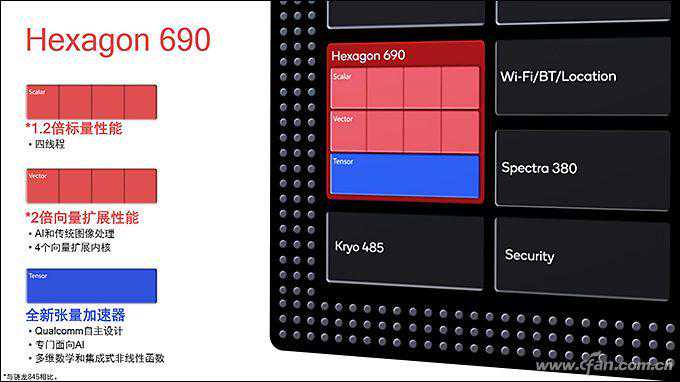 随着VR/AR应用,以及AI人工智能的兴起,高通赋予了DSP单元更多能力,其中就包括向量扩展(HVX)和Tensor张量加速器。