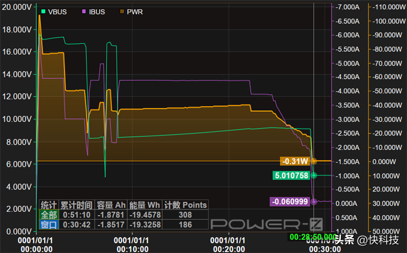 我们使用POWER-Z进行充电测试,期间最高的充电功率达到110W左右,不过仅维持了几秒钟,在充电过程中大部分还是以40W的功率进行,最终手机从1%至完全充满消耗了28分50秒,对于等效5000mAh的大容量电池来说,iQOONeo7SE的充电速率也能排在行业前列。